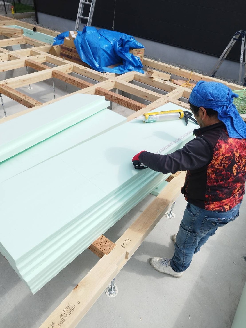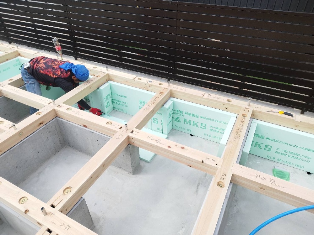 土台を造って、本日は、断熱材の施工をしています♪